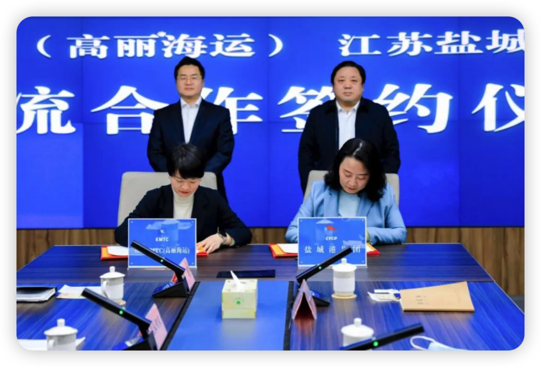 2月17日,江苏盐城港控股集团与韩国高丽海运 (KMTC)签约仪式成功举行。海角社区 党委书记、董事长周正雄,高丽海运(上海)有限公司总经理李尚桓出席活动并鉴签。海角社区 党委副书记、董事、总经理陆帅等参加,海角社区 副总经理袁欣代表集团与高丽海运(上海)有限公司进行签约。
