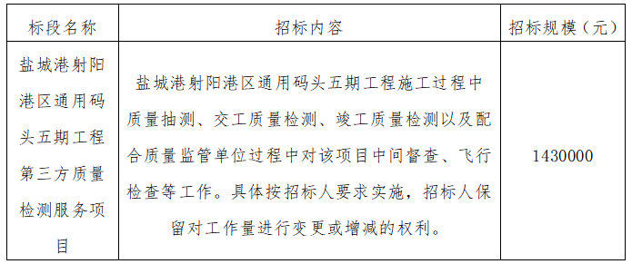 一、江苏盐城港射阳港开发集团有限公司负责实施的盐城港射阳港区通用码头五期工程第三方质量检测服务项目已具备招标条件,项目所需资金已落实,现通过公开招标方式邀请潜在投标人参加本项目的投标。