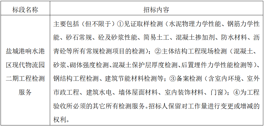 8、项目标段划分:盐城港响水港区现代物流园二期工程检测服务共为1个标段,标段信息如下: