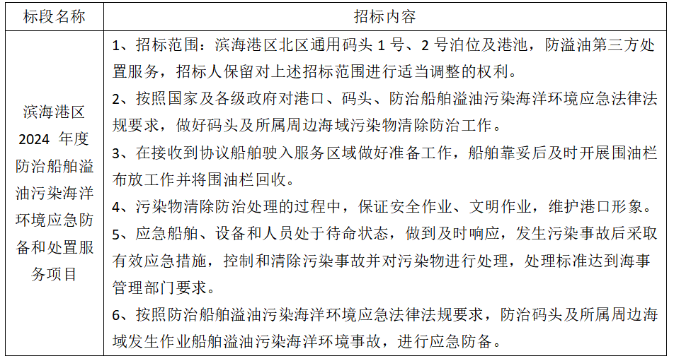 1、项目名称:滨海港区 2024 年度防治船舶溢油污染海洋环境应急防备和处置服务项目