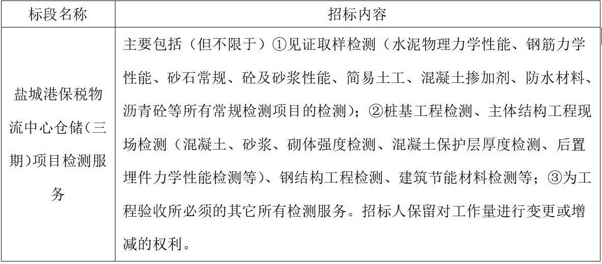 (7)项目标段划分:盐城港保税物流中心仓储(三期)项目检测服务共划分1个标段,标段信息如下: