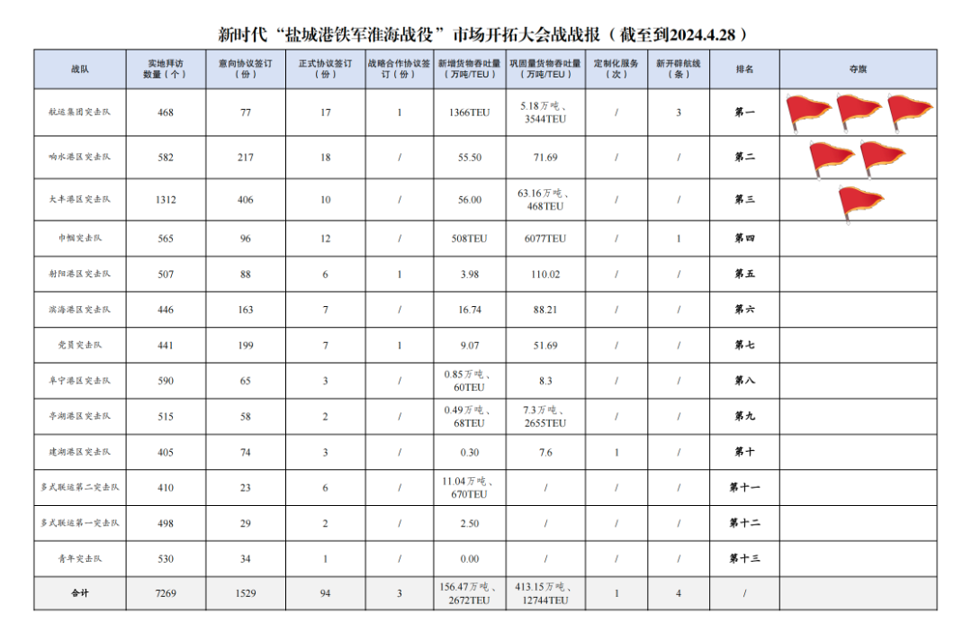 1.累计拜访客户数量7269家:其中大丰港区突击队1312家,阜宁港区突击队590家,响水港区突击队582家,巾帼突击队565家,青年突击队530家,亭湖港区突击队515家,射阳港区突击队507家,多式联运第一突击队498家,航运集团突击队468家,滨海港区突击队446家,党员突击队441家,多式联运第二突击队410家,建湖港区突击队405家。