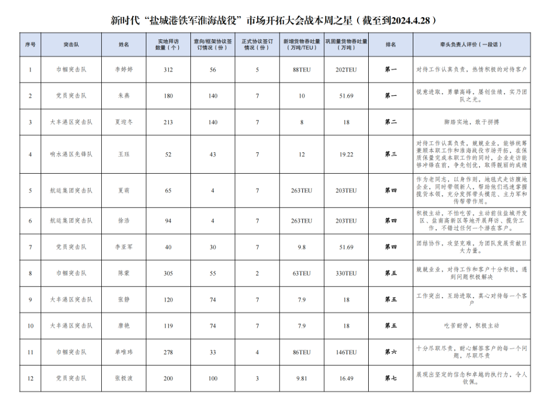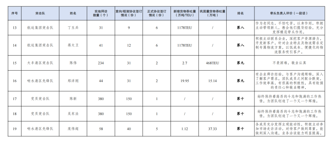 第一名:巾帼突击队 李婷婷(拜访客户312家,签订意向协议56份,签订正式协议5份,新增货物吞吐量88TEU,巩固量货物吞吐量202TEU);党员突击队 朱燕(拜访客户180家,签订意向协议140份,签订正式协议7份,新增货物吞吐量10万吨,巩固量货物吞吐量51.69万吨)