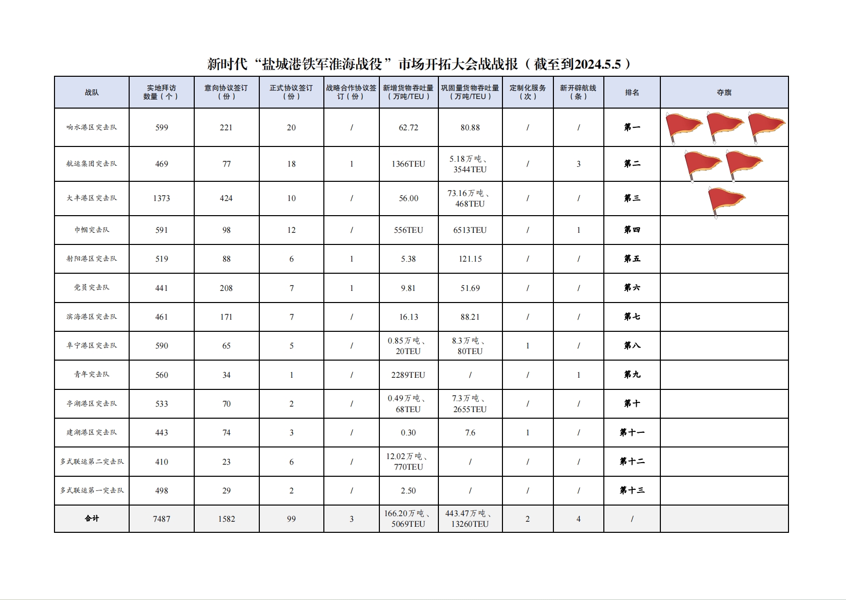 第一名:大丰港区突击队 夏迎冬(拜访客户223家,签订意向协议148份,签订正式协议7份,新增货物吞吐量18万吨,巩固量货物吞吐量10万吨);