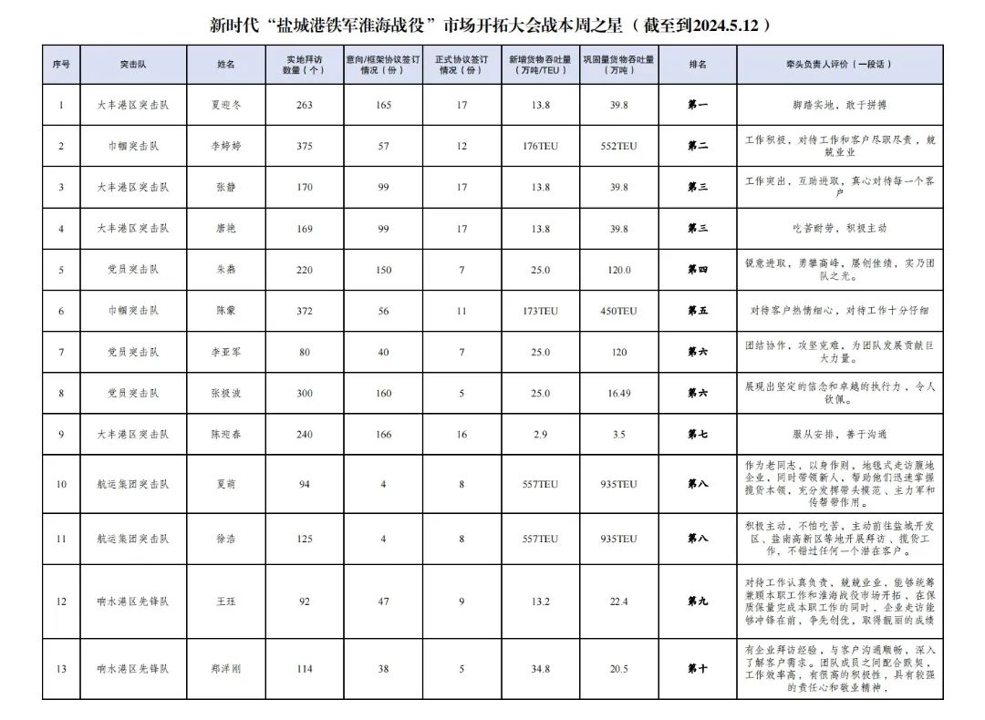第一名:大丰港区突击队 夏迎冬(拜访客户263家,签订意向协议165份,签订正式协议17份,新增货物吞吐量13.8万吨,巩固量货物吞吐量39.8万吨);