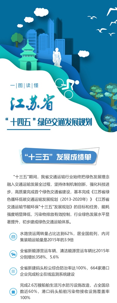 至“十四五”末,全面实现绿色能源消费占比、岸电使用率、铁路和水路运输周转量占比、绿色出行比例“4提升”,营运货车、营运货船、港口生产碳排放强度和营运船舶氮氧化物排放总量“4下降”——近日,省交通运输厅正式印发《江苏省“十四五”绿色交通发展规划》(以下简称《规划》),明确提出“十四五”期间全省绿色交通发展按照“11478”的思路开展,实现“4升4降”,形成与资源环境承载力相匹配、与生产生活生态相协调的交通运输发展新格局,有效支撑我省碳达峰碳中和目标如期实现。