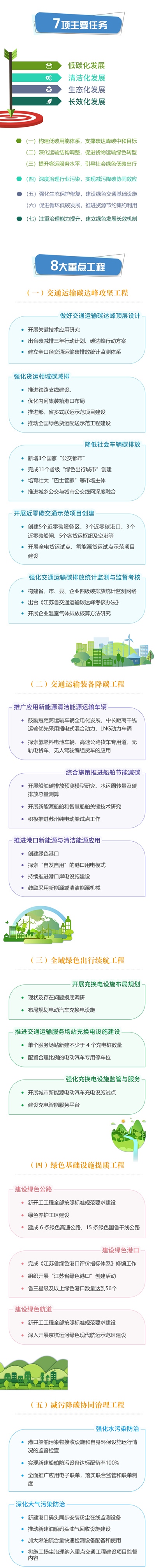 围绕这4条发展主线,《规划》提出江苏绿色交通发展7大主要任务:构建低碳用能体系,支撑碳达峰碳中和目标;深化运输结构调整,促进货物运输绿色转型;提升客运服务水平,引导社会绿色低碳出行;深度治理行业污染,实现减污降碳协同效应;强化生态保护修复,建设绿色交通基础设施;促进循环低碳发展,推进资源节约集约利用;注重治理能力提升,建立绿色发展长效机制。