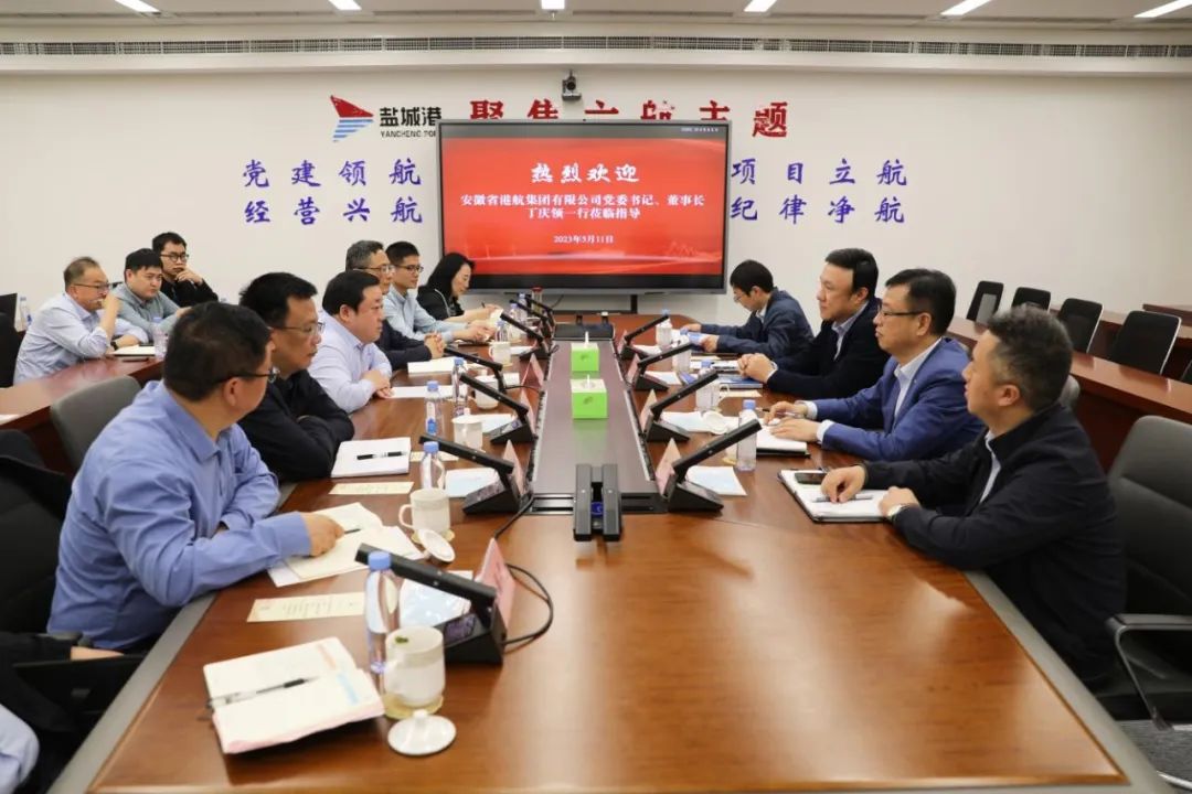 周正雄对丁庆领一行的到访表示欢迎,对安徽省港航集团在盐城港发展过程中给予的关心和支持表示感谢,并介绍了盐城港相关情况。他说,2020年,市委、市政府整合全市沿海和内河港口资源,形成河海联运一体化格局,实现以港口资源的高效整合利用带动港城、港产联动发展。集团成立以来,着力强化内外资源整合优化,全力以赴抓好生产经营,于2021年首次跻身全国亿吨大港行列,并在全国沿海港口竞争中持续实现争先进位,同时在前两年发展的基础上深入开展全面深化改革创新各项工作,为如期完成集团首个五年规划各项目标任务打好基础。当前,集团抢抓淮河入海水道改航道契机,将淮河流域作为未来发展的重点领域和方向,持续深耕淮河流域市场,加快融入国内国际双循环新格局,努力为港口在未来发展中赢得先机、赢得主动。恳请安徽省港航集团一如既往地关注和支持盐城港的发展,盐城港有信心与安徽省港航集团在码头共建、汽车滚装运输业务开拓等领域加强合作,实现双方合作共赢。