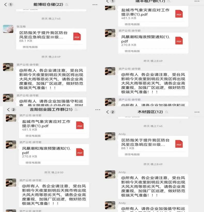广宣传 强提醒。公司安全环保部密切关注台风动向,加强预警预报,第一时间通过工作群转发《盐城市气象灾害应核对工作提示单》及各类预警信息,通过层层宣传,扩大台风预警范围,一方面提示小区居民做好户外物品收回、非必要不出门等安全防范工作;另一方面提高承租户应对防御台风的重视程度。