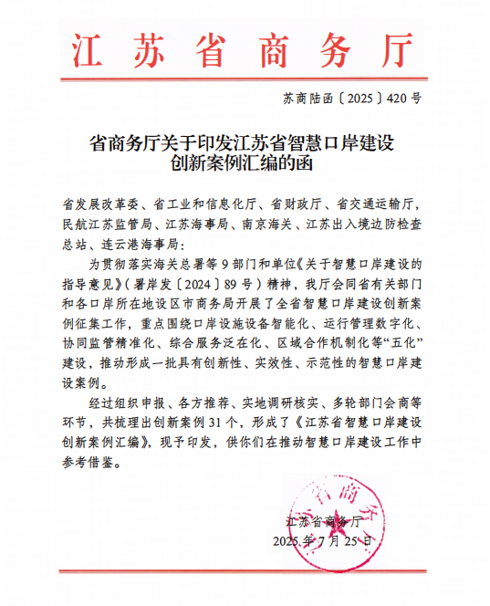 近日,江苏省商务厅印发《江苏省智慧口岸建设创新案例汇编》,海角社区 建设的“一体化海河联运集装箱生产管理系统”成功入选,成为全省31个智慧口岸建设创新案例之一。该系统的运用,实现了港口生产全流程的自动化与协同化,显著提升了作业效率和服务水平,为全省智慧口岸建设提供了可复制、可推广的先进经验。