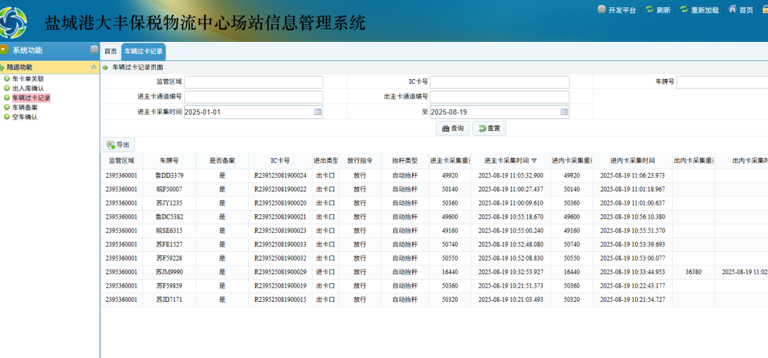 积极探索创新路径,聚焦系统智能化升级,通过对场站系统进行深度智能化改造,集成车卡关联、堆场管理、监管仓管理、基础资料管理等功能模块,实现了实际重量卡口自动填报、自动申报、车卡自动关联及到货确认的全流程自动化,作业效率显著提升40%,数据准确率高达99.9%,为保税物流业务的高效运作提供了坚实的技术支撑。