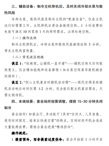 酒店专门编制空调节能操作指南,围绕“负荷匹配、避免空耗、按需供冷”三大原则,通过灵活调节水温、分时运行风机、合理预判宴会需求等方式,从设备运行到场景适配全流程优化,节电效果显著。