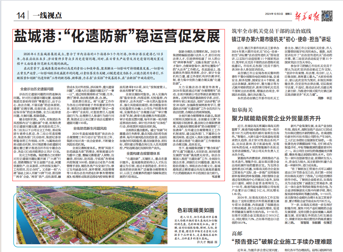 合规管理专业化水平稳步攀升。增设合规管理委员会、总法律顾问、首席合规官,发布《集团依法治企合规管理三年行动计划(2023-2025)》,重点任务全部圆满收官。凭借持续深耕,集团成功斩获省内港口行业首张合规管理体系认证证书,下属射阳港集团、滨海港集团、航运集团紧随其后通过认证,合规管理水平跻身行业前列。