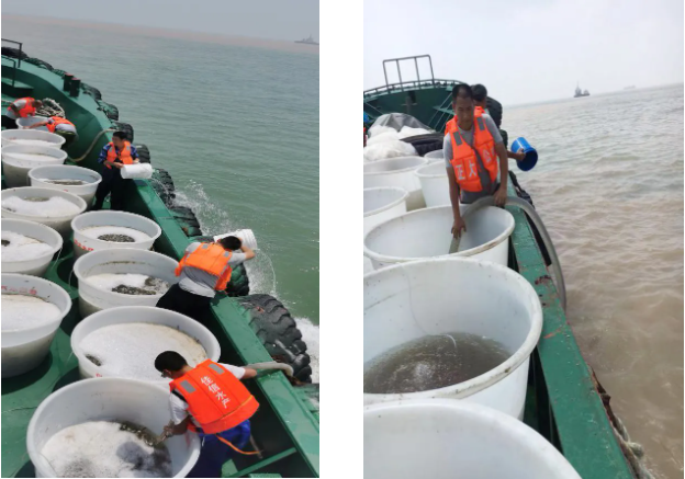 活动过程中,省海洋水产研究所中心实验室、滨海县农业农村局、滨海县公证处工作人员全程参与,现场核查种苗数量、规格、质量,办理现场验收手续,并乘坐货轮前往放流海域共同见证放养种苗,以实现海洋资源恢复,改善海洋生态环境。