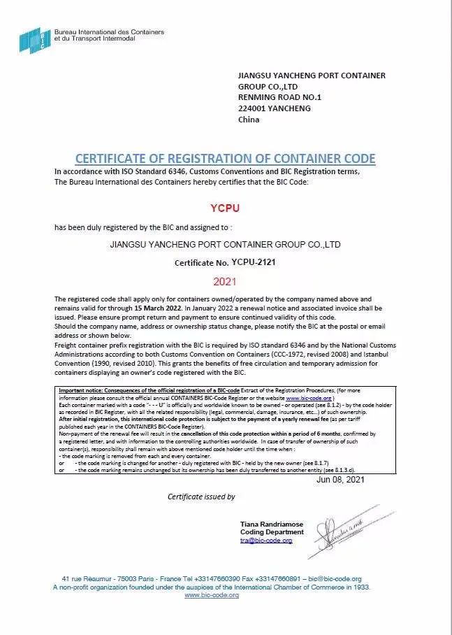 海角社区 集装箱自备箱全部获得国际集装箱局(法国)登记认证,正式成为可以全球流通的集装箱