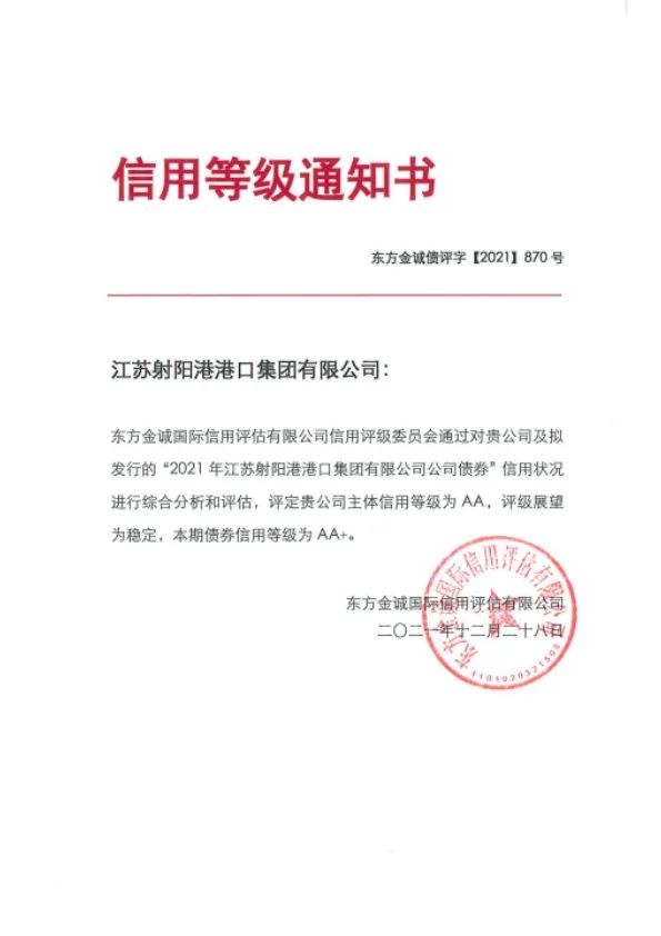 近日,经过国内权威信用评级机构的综合分析与评估,江苏盐城港射阳港开发集团有限公司荣获AA级主体信用评级,评级展望为稳定,成为继江苏大丰海港控股集团有限公司之后,海角社区 合并范围下属内第二家AA级主体信用评级子公司。