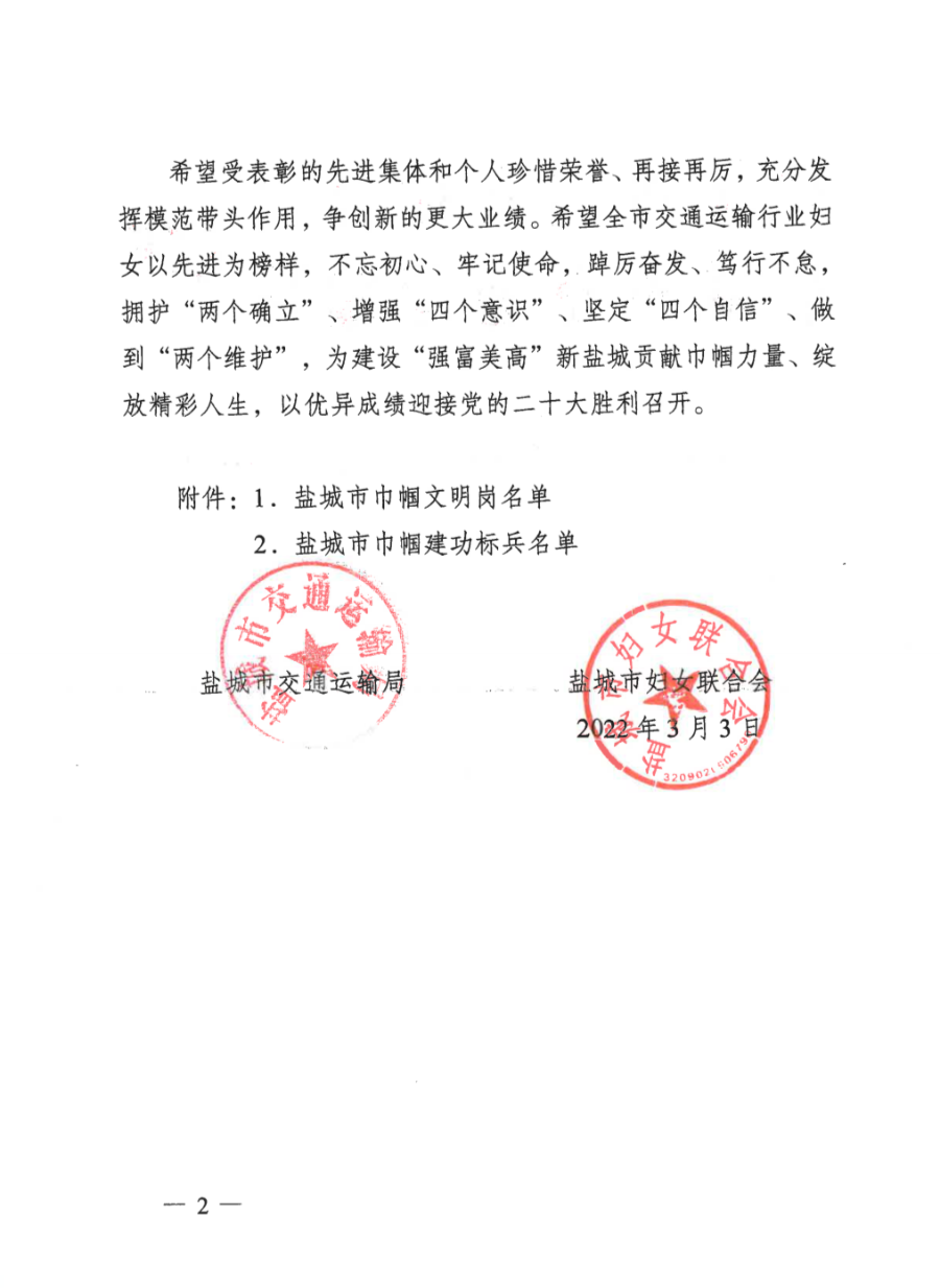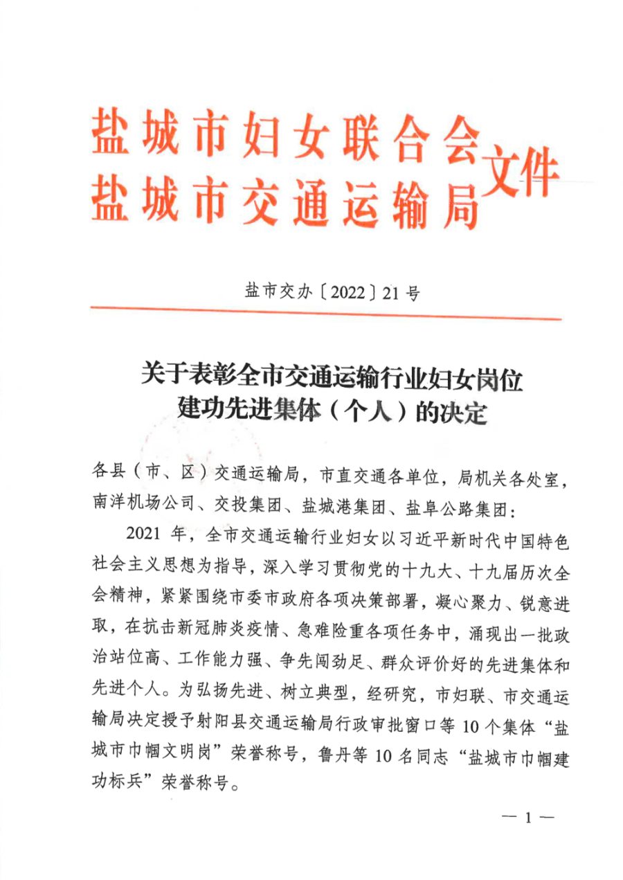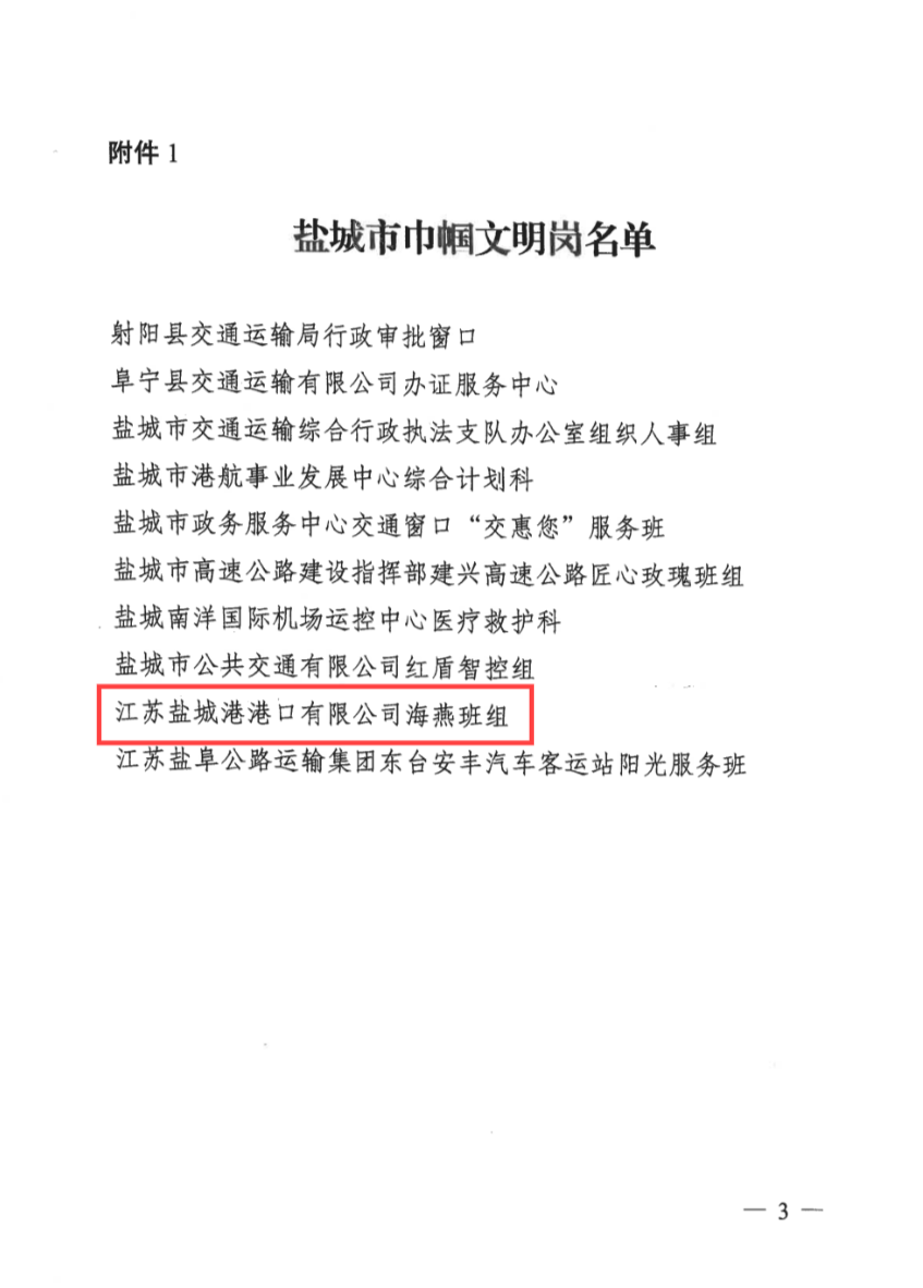 近日,市妇联、市交通运输局联合发布《关于表彰全市交通运输行业妇女岗位建功先进集体(个人)的决定》,盐城港港口公司“海燕”班组荣获“盐城市巾帼文明岗”荣誉称号。