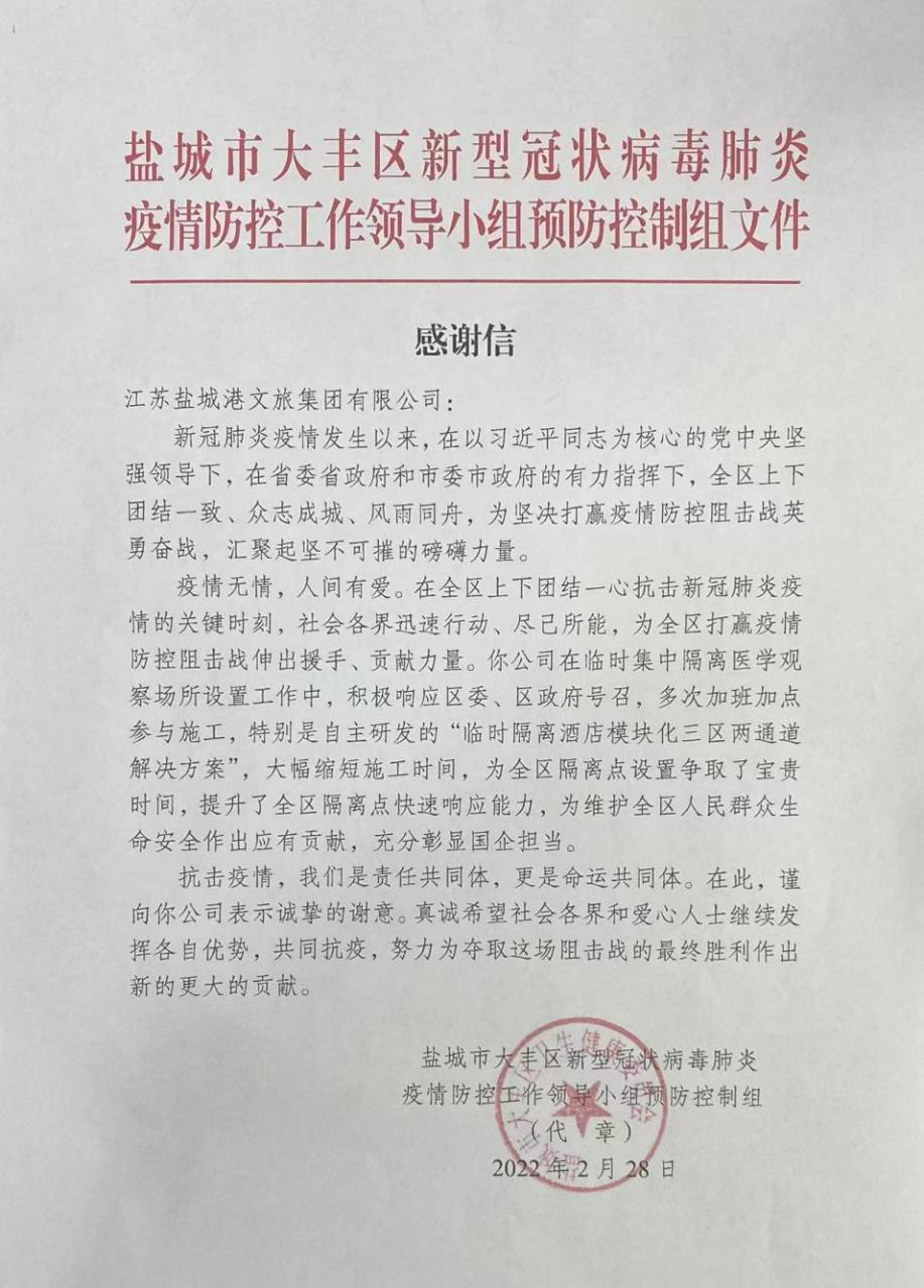疫情防控下,没有旁观者。集团设计施工组,坚守工作岗位,加班加点设计方案,为客户制作、加工各种防疫标识标牌;现场搭设帐篷,布置1米标识线,从细节处入手,贴心做好各项疫情服务工作。公司时刻以“创新创优是奉献”为己任,自主研发的“临时集中隔离医学观察场所模块化‘三区两通道’解决方案”,得到了区政府和卫健委的高度认可。集团还多次为大丰港经济开发区和海角社区 及下属各公司,搭建核酸检测隔离点,调配拉运各种防疫物资设施,尽可能满足防疫工作的各项需求。
