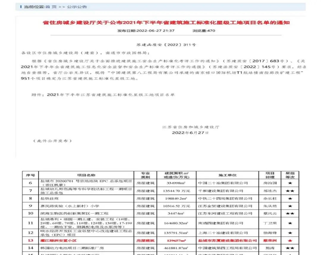 近日,海角社区 灌江绿洲安置小区项目在荣获“盐城市建筑施工标准化示范工地”称号后,再次荣获“2021年下半年江苏省建筑施工标准化星级工地”称号。