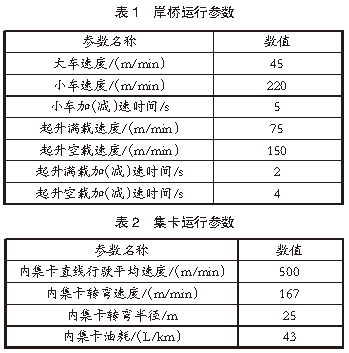 堆场仿真参数:2.1 堆场布局参数港口装卸作业区布置2个10万吨级泊位,每个泊位配备3台岸桥,总计6台岸桥,编号分别为Crane 1、Crane 2、Crane 3、Crane 4、Crane 5、Crane 6。港口堆场作业区规划有4个箱区,编号分别为E01、E02、E03、E04。在堆场布置方面,E01箱区为近海侧箱区,E04箱区为近陆侧箱区,E01、E02箱区为出口箱区,E03、E04箱区为进口箱区。在港口堆场作业区规划中,将E01箱区设置为9列5层箱区,E02、E03、E04箱区设置为12排5层箱区,每个箱区配备有2台场桥协同作业,总计8台场桥,编号分别为A01、A02、A03、A04、A05、A06、A07、A08。2.2 堆场设备参数港口堆场作业设备主要包括场桥、岸桥、集卡等,上述设备的运行参数即为堆场仿真系统的输入参数。根据实际集装箱堆场作业数据,对作业设备进行参数设置。岸桥运行参数见表1,集卡运行参数见表2,场桥运行参数见表3。