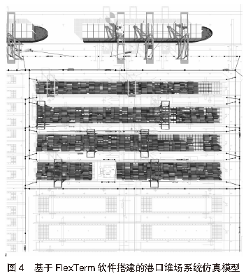 3.2 堆场仿真系统模型根据堆场仿真系统架构,以某港口自动化堆场作业的实际运行环境为基础,分别搭建基于AnyLogic软件和FlexTerm软件的港口自动化堆场系统仿真模型。基于AnyLogic软件搭建的港口堆场系统仿真模型见图3,基于FlexTerm软件搭建的港口堆场系统仿真模型见图4。