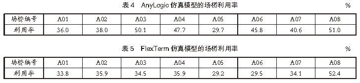 4仿真结果分析利用港口自动化堆场相关数据,分别对基于AnyLogic软件和FlexTerm软件的堆场系统仿真模型的仿真结果进行对比分析。4.1 场桥利用率对比在集装箱堆场作业中,场桥是提高堆场作业效率的关键因素。合理分析场桥利用率对提高堆场作业效率、减少船舶在港停泊时间尤为重要。根据港口提供的堆场作业参数和实际堆场作业的场桥利用情况,对堆场内场桥使用情况进行仿真对比分析。AnyLogic仿真模型的场桥利用率见表4,FlexTerm仿真模型的场桥利用率见表5,2种仿真模型的场桥利用率对比见表6。