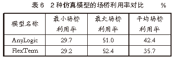 经综合分析发现,无论是单一场桥利用率还是平均场桥利用率,AnyLogic仿真模型的数据结果都普遍高于FlexTerm仿真模型的数据结果。通过分析堆场作业系统仿真流程发现,上述差异是由2种仿真模型的作业指令生成模式不同导致的。在相同的作业时段内,AnyLogic仿真模型的作业指令生成的作业数量要高于FlexTerm仿真模型的作业指令生成的作业数量,从而导致AnyLogic仿真模型的场桥利用率高于FlexTerm仿真模型的场桥利用率。根据港口提供的数据,全年该港口自动化堆场的场桥利用率在40%~60%。基于AnyLogic仿真模型和FlexTerm仿真模型仿真得到的平均场桥利用率分别为42.4%、35.7%。显然,与FlexTerm仿真模型的仿真结果相比,AnyLogic仿真模型的仿真结果同实际作业数据的统计结果更接近。究其原因,这是由2款仿真模型的集装箱装卸作业指令的生成模式不同导致的。对堆场作业系统仿真流程分析发现:在AnyLogic仿真模型中,集装箱装卸作业指令是根据港口历史数据,借助算法计算生成的,比较接近港口的实际作业数据;在FlexTerm仿真模型中,集装箱装卸作业指令是利用软件自带作业计划模块,通过配置船期、堆场计划等参数自动生成的,与港口实际作业数据之间存在一定的差距。4.2 堆场使用情况对比为了合理规划堆场空间资源,根据港口提供的船期、堆场计划等参数,对港口堆场的使用情况进行仿真对比分析。AnyLogic仿真模型与FlexTerm仿真模型堆场通过能力对比见表7。由表7可知,在相同输入条件下,AnyLogic仿真模型和FlexTerm仿真模型仿真模拟得到的堆场利用情况和堆场通过能力基本一致。但由于泊位船舶计划较为宽松,船期密度小于实际船期数据,AnyLogic仿真模型和FlexTerm仿真模型的堆场通过箱量分别为632 300 TEU和632 863 TEU,均小于港口全年实际堆场通过箱量724 272 TEU。