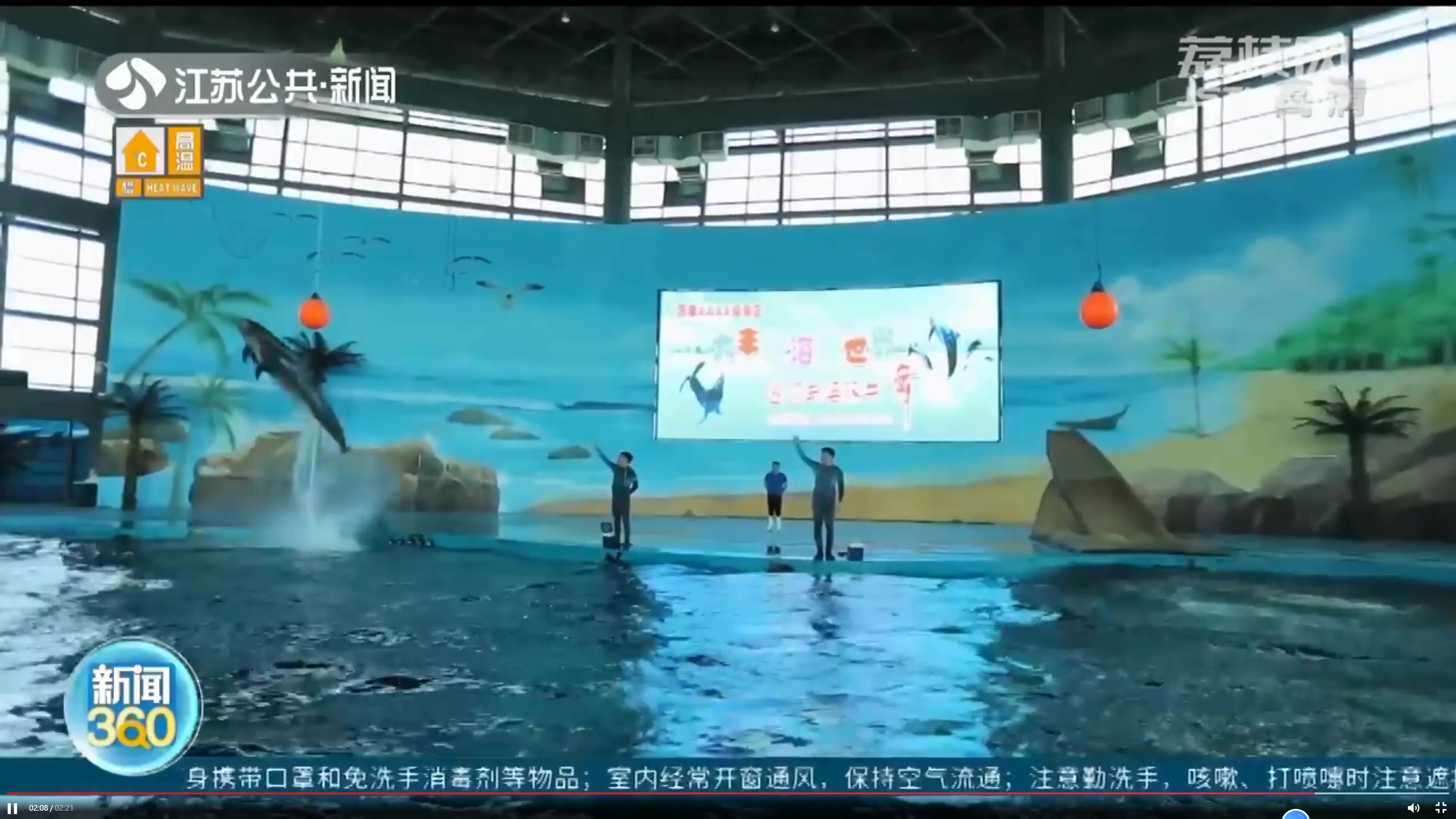 新闻中展示了盐城港海洋馆内的驯养员与海豚互动表演,驯养员时而骑在海豚身上,让海豚在水池中快速滑翔,时而指挥海豚,让海豚在水池中高高跃起击中悬挂的气球,憨态可掬又灵活精怪的海豚带来的精彩表演引来现场观众阵阵喝彩。