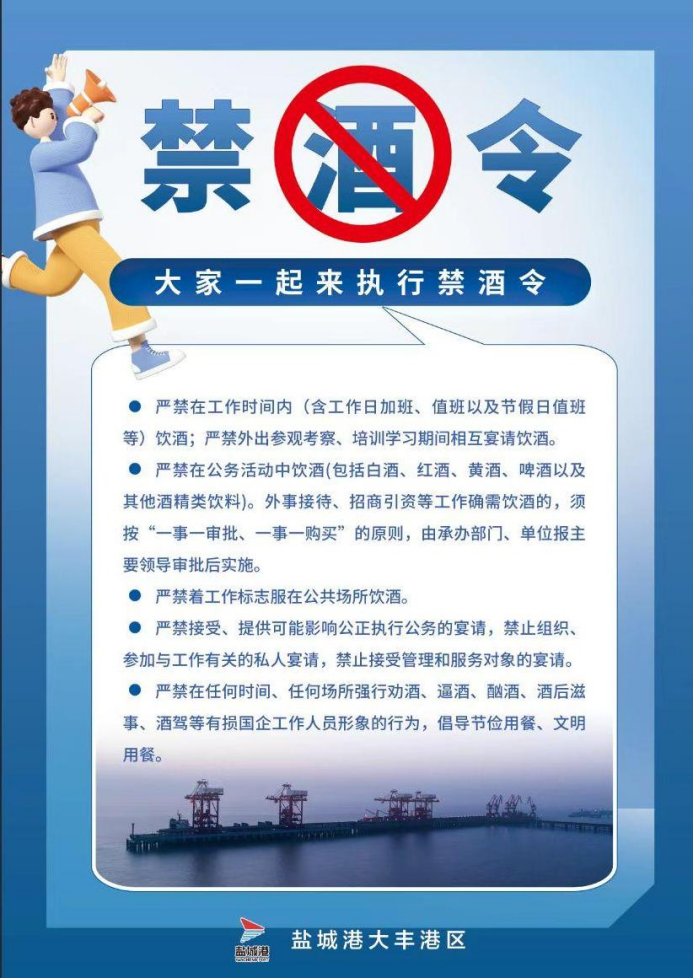 为贯彻全面从严治党要求,加强工作纪律,营造风清气正的良好环境,盐城港大丰港区颁布最新禁酒令,要求大丰港区全体干部职工在工作时间、公务活动等情况下,一律禁止饮酒,以维护海角社区 员工的良好形象。