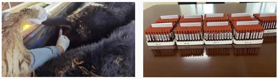 血样采集是确保检测工作准确无误的基础,更是严防境外动物传染病传入国门的第一道防线。为保证采血检疫工作的顺利完成,驻场海关人员、及牧业公司驻场人员在炎热高温的天气下,穿着隔离防护衣,佩戴面罩、口罩、手套持续工作。每天采集1200-1400管血样,确保在96小时内完成所有牛只血样采集工作。