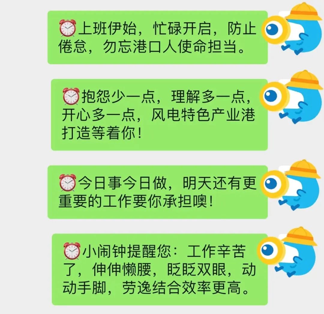 新时期,随着盐城港一体化融合发展驶入快车道。面对新形势、新任务,快节奏、高效率成为必然要求。针对办公室员工伏案使用电脑工作,长期处于静态易产生颈肩疼痛、眼睛酸涩等疲劳现象,特别是在工作推进中遇到困难和问题时,易引发懈怠心态的情况。射阳港区在强化学习教育、增强员工使命感和责任感的同时,创造性地设立了“闹钟小贴士”,提醒员工做好自我调节,时刻保持昂扬奋进的精神状态,保质保量完成每日工作任务。