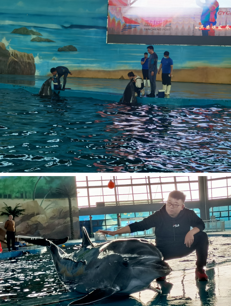 文旅集团海洋世界所饲养的两头海豚,学名日本宽吻瓶鼻海豚,他们来大丰港区已经生活了六年多,已充分适应了这里的环境。在我们驯养团队的精心照料下,快乐地成长。驯养师每天精心准备海豚宝宝喜爱吃的俄罗斯进口的鲱鱼、日本进口的多春鱼以及挪威进口的鱿鱼,一个海豚的日食量达到10公斤。同时每日为其补充各种维生素。我们每天检测他们的体温、用插胃管的方式“饮水”。正常情况下,每月为其全面体检一次,包括采血检验、胃镜检查、呼吸空气采样送检,从而确认他们身体处于健康状态。