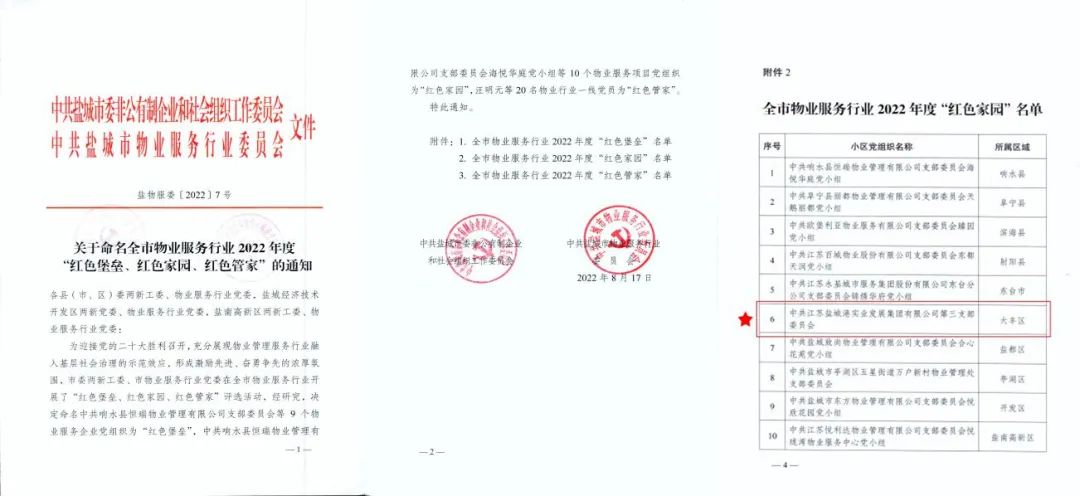 近日,盐城港物业公司党支部充分发挥党组织示范引领作用和党员先锋模范作用,在众多基层党组织中脱颖而出,喜获2022年盐城市物业管理行业“红色家园”荣誉称号。