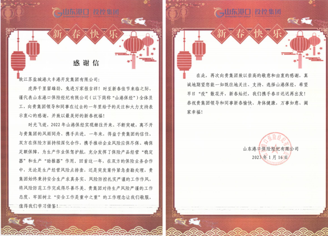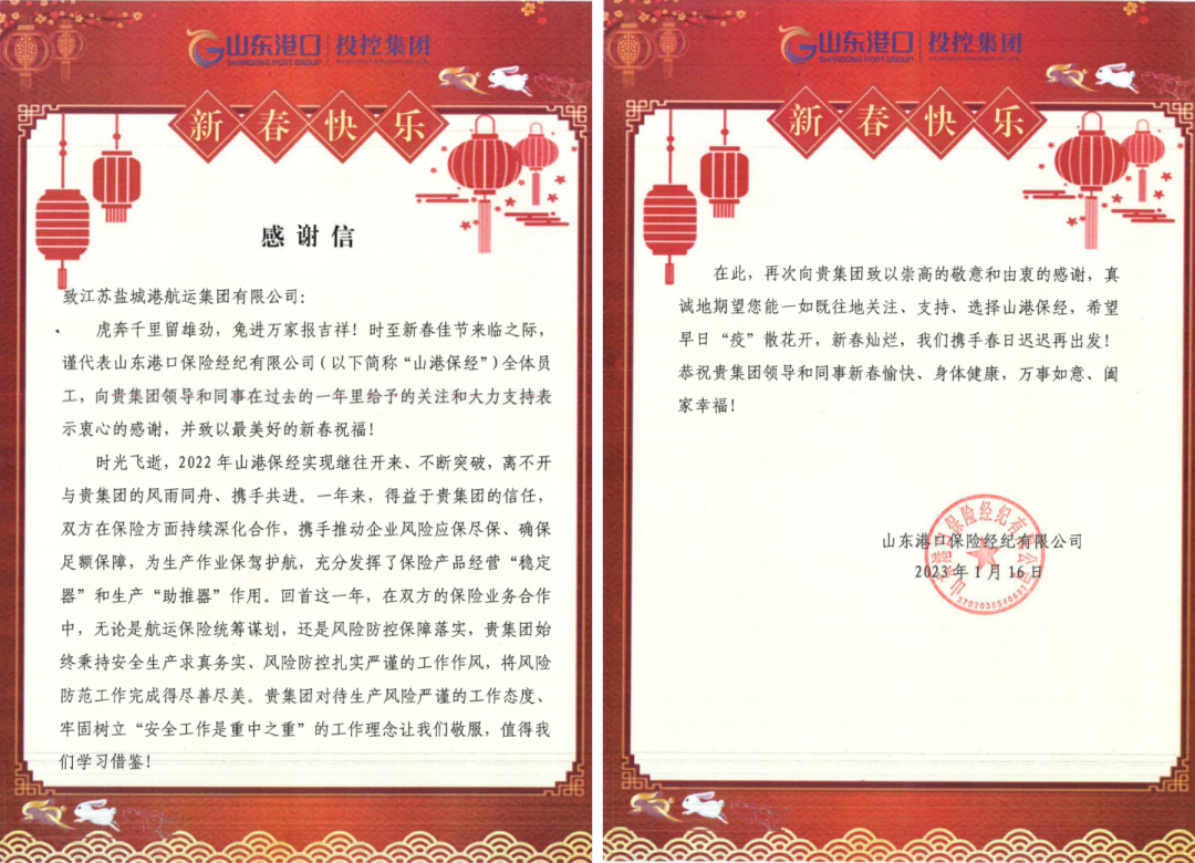 新岁序开,同赴新程。近日,集团下属江苏盐城港大丰港开发集团、江苏盐城港港口公司、江苏盐城港航运集团三家单位分别收到来自山东港口保险经纪公司的感谢信。纸短情长,字字暖心。一封封感谢信,道出了盐城港和山东港携手发展的深厚情谊。