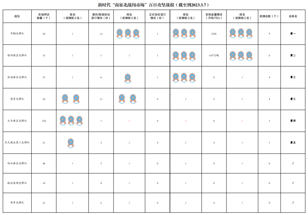 1.累计拜访客户数量523家:其中大丰港区先锋队103家,党员先锋队56家,多式联运第二先锋队51家,巾帼先锋队50家,建湖港区先锋队49家,响水港区先锋队46家,射阳港区先锋队31家,滨海港区先锋队31家,亭湖港区先锋队29家,多式联运第一先锋队24家,青年先锋队21家,阜宁港区先锋队18家,航运集团先锋队14家。