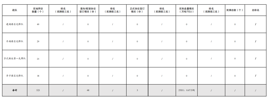 2.签订意向/框架协议数量48份:其中巾帼先锋队14份,党员先锋队11份,滨海港区先锋队6份,响水港区先锋队5份,多式联运第二先锋队4份,航运集团先锋队4份,青年先锋队2份,射阳港区先锋队1份,大丰港区先锋队1份。