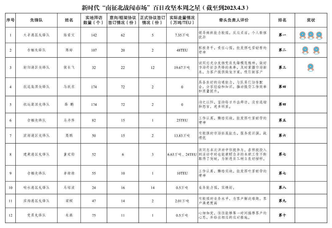 第一名:航运集团先锋队3.59万吨、182TEU,射阳港区先锋队19.67万吨