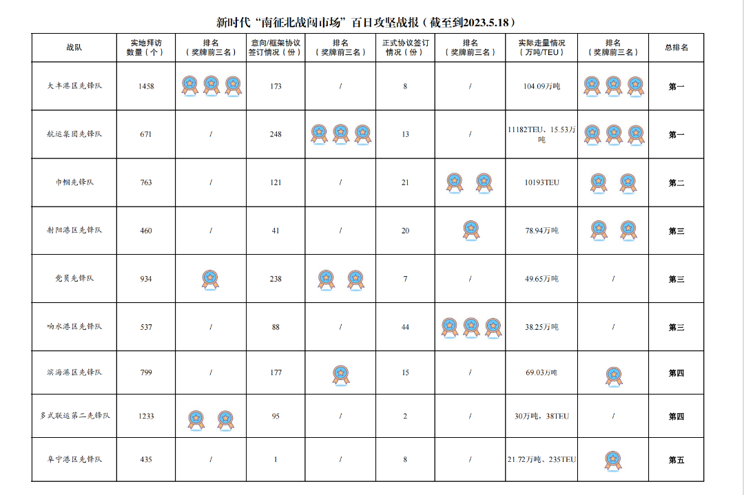 1.累计拜访客户数量9907家:其中大丰港区先锋队1458家,多式联运第二先锋队1233家,党员先锋队934家,滨海港区先锋队799家,多式联运第一先锋队769家,巾帼先锋队763家,建湖港区先锋队693家,青年先锋队674家,航运集团先锋队671家,响水港区先锋队537家,亭湖港区先锋队481家,射阳港区先锋队460家,阜宁港区先锋队435家。