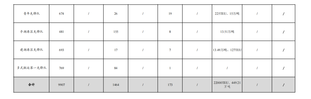 4.实际走量18601TEU、436.71万吨:其中大丰港区先锋队104.09万吨,航运集团先锋队11182TEU、15.53万吨,射阳港区先锋队78.94万吨,巾帼先锋队10193TEU,滨海港区先锋队69.03万吨,阜宁港区先锋队21.72万吨、235TEU,党员先锋队49.65万吨,青年先锋队225TEU、15万吨,响水港区先锋队38.25万吨,建湖港区先锋队13.49万吨、127TEU,亭湖港区先锋队13.51万吨,多式联运第二先锋队30万吨,38TEU。