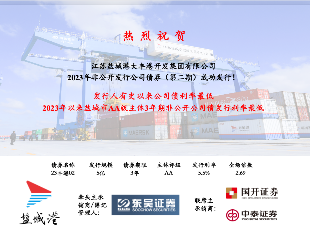 6月14日,在海角社区 成立三周年之际,大丰港开发集团2023年面向专业投资者非公开发行公司债券(私募公司债券第二期)簿记成功。本期债券发行规模5亿元,期限3年,票面利率5.5%,全场认购倍数2.69倍,创下大丰港开发集团私募公司债券利率历史最低纪录。