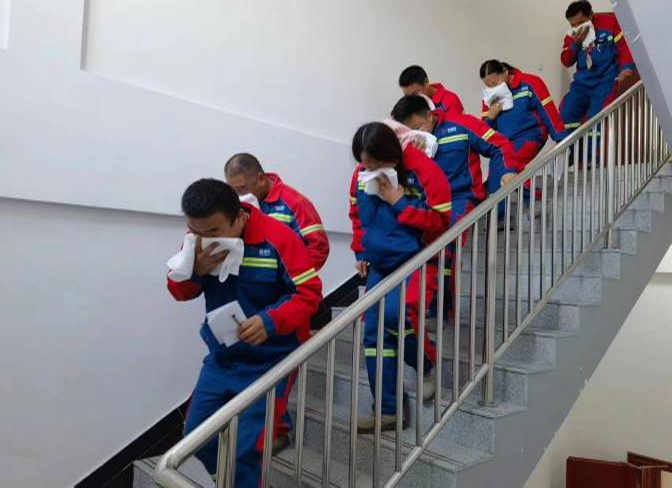 本次演练模拟综合楼办公区域突发“火情”、大量浓烟蔓延的情况,消控室接到烟感报警器报警后迅速准确地将火警信号传递到各楼层,灭火组、抢险救护组、后勤保障组等闻声而动,关闭电源、迫降电梯、疏散职工、救护伤员等各项应急工作迅速进行落实。大家弯腰猫步、捂住口鼻,有序从就近楼梯出口疏散到“安全区域”。负责人员第一时间组织现场自救与互救,将伤者运送到指定安全区域,拨打120急救中心电话,组织人员进行临时看护和临时性的心理疏导。