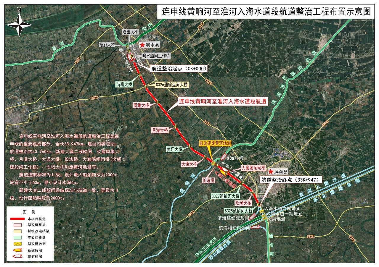 据了解,连申线黄响河至淮河入海水道段航道整治工程,起自黄响河与通榆河交汇处,讫于淮河入海水道与通榆河交汇处,全长33.95公里,整治里程30.64公里,按二级航道标准建设,设计最大船舶吨级为2000吨级,通航水深不小于4米。新建大套二线船闸1座,改建桥梁6座,原规模改建废黄河地涵1座(含北排闸)。投资估算40.83亿元,建设工期4年。