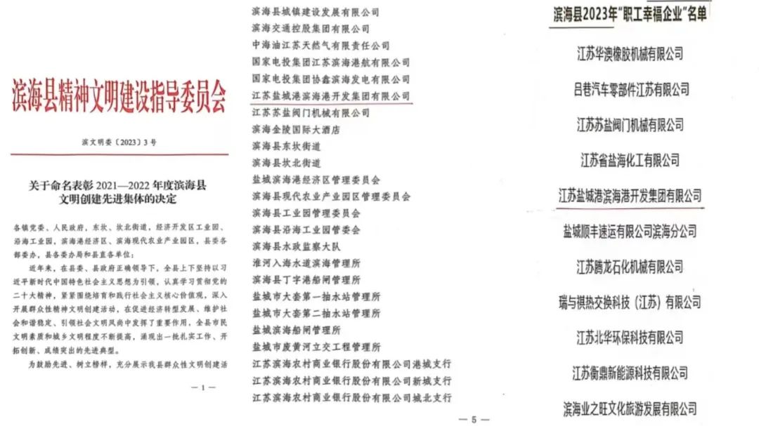 近日,滨海县总工会公示了提升职工生活品质2021—2022年度县文明创建先进集体、2023年滨海县“职工幸福企业”名单,滨海港区再获两项荣誉。