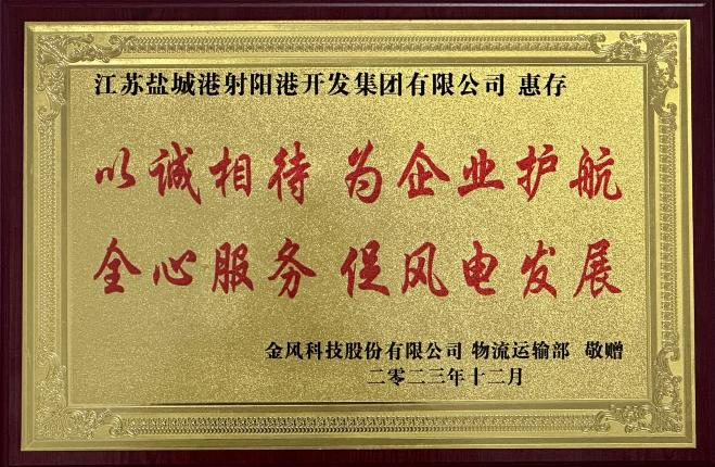 坚守责任之心,勇担使命之任。近日,盐城港射阳港区收到金风科技股份有限公司赠送的“以诚相待 为企业护航,全心服务 促风电发展”的荣誉牌匾,对盐城港射阳港区及时、迅速、高效为企业解决运输过程中的难题表示衷心感谢。