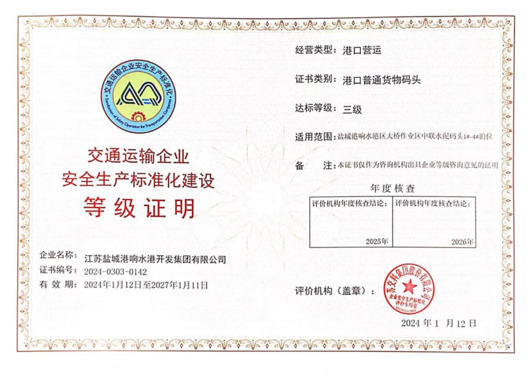 近日,盐城港响水港区灌江港务分公司顺利通过交通运输企业安全生产标准化认证考核,并取得“交通运输企业安全生产标准化建设三级证书”,标志着响水港区灌江港务分公司安全生产管理工作迈上新台阶。