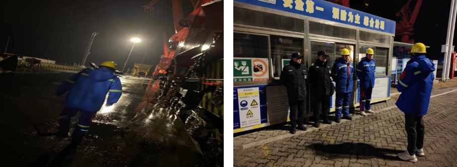 是班组长、是设备保障员,也是党员。“我是党员我先上”是我们每个人的行为准则。寒潮来临前,他们仔细检查门机锚定插板、防风拉锁、防爬器、铁楔是否完全插入槽内;利用加杆检查链条连接环是否受力至最大值;严格检测防爬器是否落地牢靠;确保恶劣天气下港区安全有序。