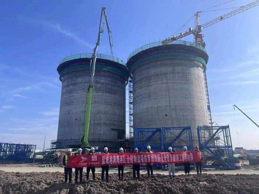 近日,滨海港区仓储物流项目首组浅圆仓仓壁顺利封顶。