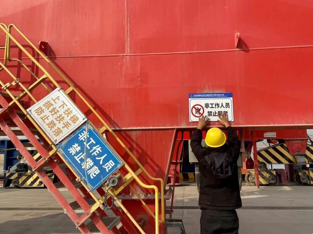 在港区门闸处设置“非作业车辆、工作人员禁止入内”标识,提示社会人员、车辆不要误闯误入港区。在引桥栏杆上悬挂“注意路口,当心货车”“禁止酒后上岗,必须戴安全帽”等标识,提醒工作人员注意自身安全,严肃上岗纪律;在码头后沿护栏上悬挂“禁止翻越”“水深危险,禁止靠近”,警示工作人员不要翻越码头护栏,远离危险水域。本次完善新增警示标识牌共十余块。