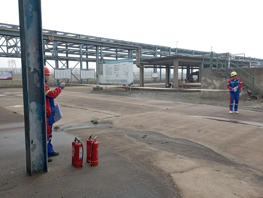 演练模拟场景二:在处置过程中由于操作人员违规使用铁器工具,引燃地面余油,引发火灾事故,现场人员用干粉灭火器灭火。