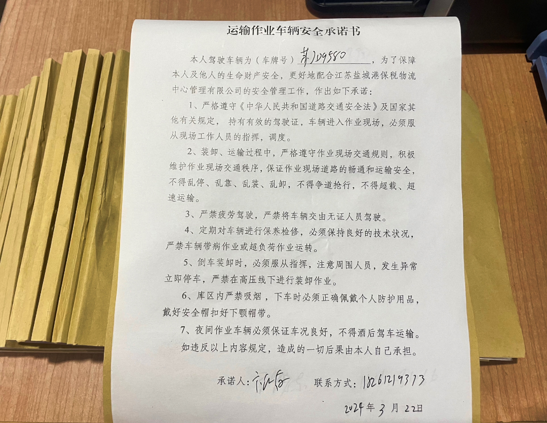 为确保整治行动取得实效,公司严格按照“四同”要求,将全员安全生产责任制落实到底,利用班前会、培训教育等方式,不断提高作业人员安全责任意识,对“三外”人员发生的违规、违章行为及时提醒制止;定期与客户进行沟通并发放安全告知函,督促他们遵守库区内的安全要求;持续加强作业现场的安全管控,加大巡查、检查力度和频次,通过视频监控、安全巡查和库区管理员联合管理,形成全方位安全管控。同时,公司还与外来车辆司机签订安全承诺书,形成常态长效的治理体系,切实提升生产现场安全管理水平。